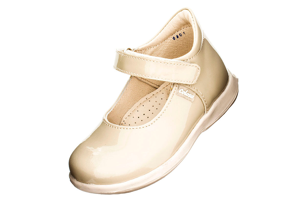 Botita para niña fabricada 100% en piel, interior de cerdo que evita la sudoración y mal olor del pie, acabado exterior en piel charol beige, cuenta con plantilla con arco soporte para el sano desarrollo del arco de tu pequeña y removible única en el mercado que te indica cuando hacer el cambio de talla, tiene cojinete en el talón que la hace muy cómodo, látigo con velcro para su sencilla colocación y suela antiderrapante.