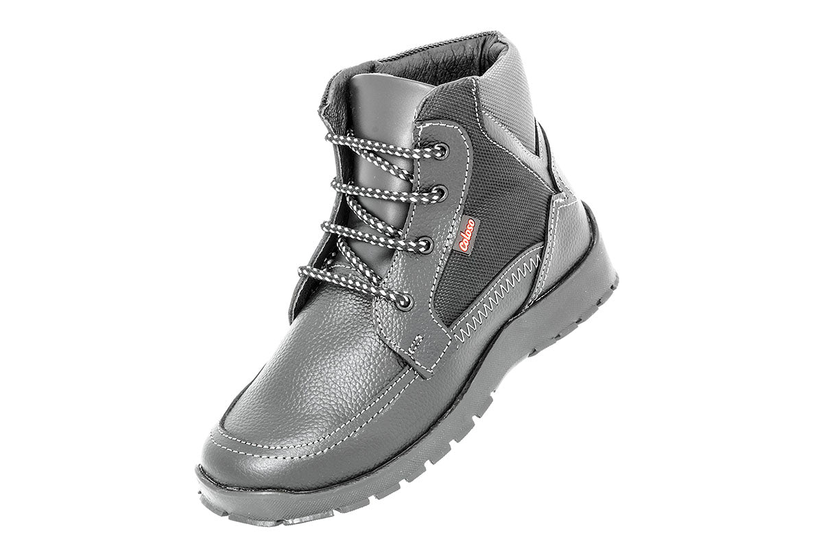 Bota para niño fabricada en piel, con pequeñas aplicaciones en textil, interior vacuno, plantilla de cerdo, suela antiderrapante, con agujeta, cómoda y segura para las aventuras de tu pequeño.