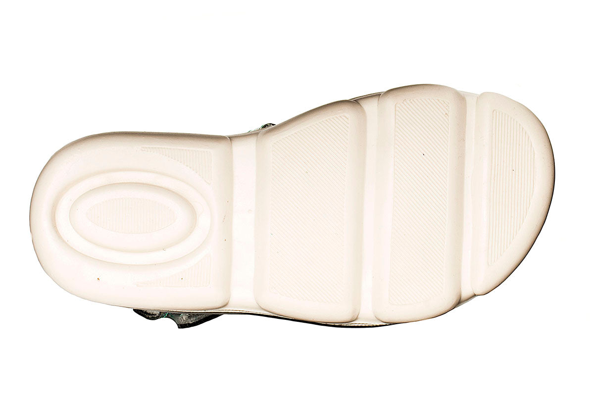 Sandalia diseñada para niña, fabricada con los materiales de la mas alta calidad , interior 100% en piel, interior de cerdo que evita la sudoración y mal olor del pie de tu pequeña, exterior en sintético glitter verde cojinete en el talón que la hace muy cómoda, látigo con velcro para su sencilla colocación y suela antiderrapante. Cómoda, ligera y fácil de combinar.